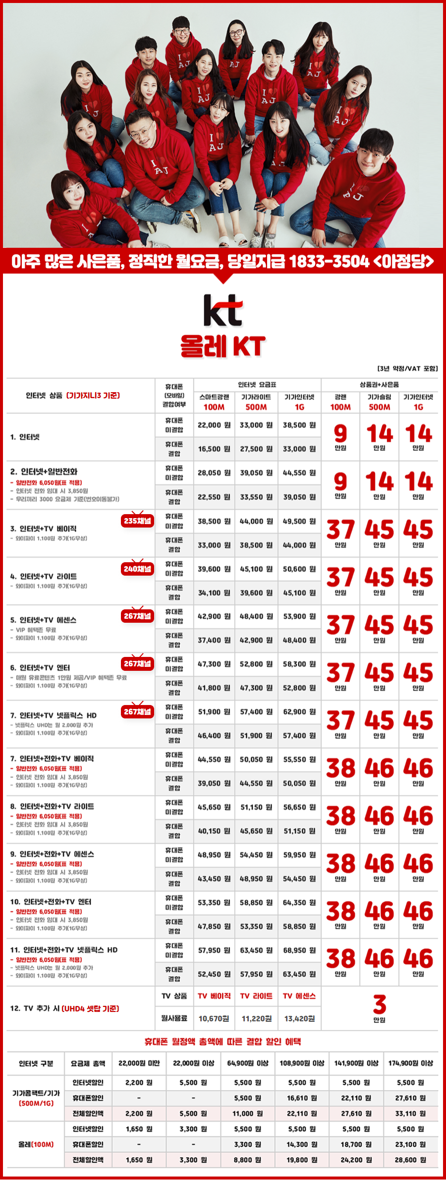 100메가 : 22,000원, 500메가 : 33,000원, 1기가 : 38,500원